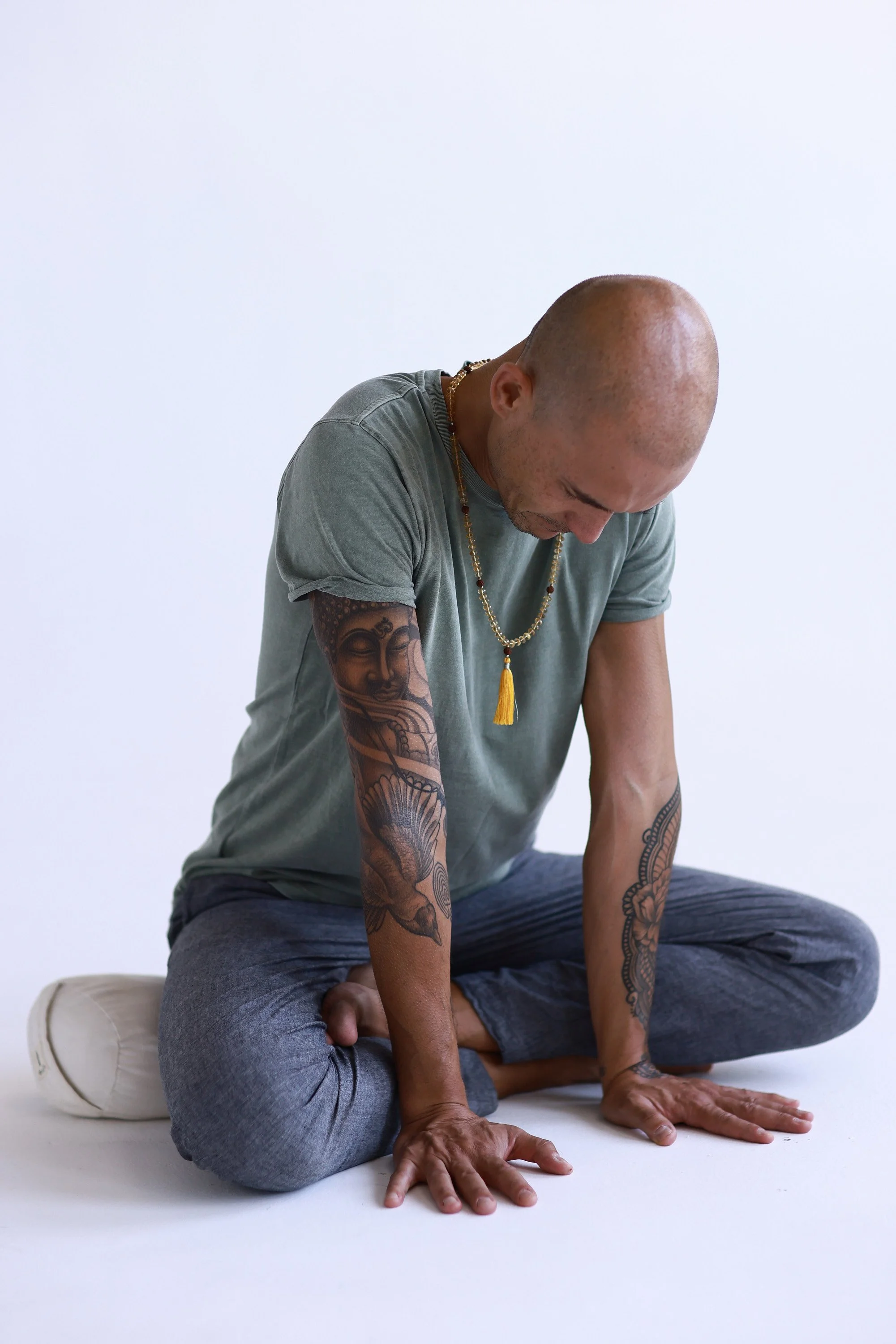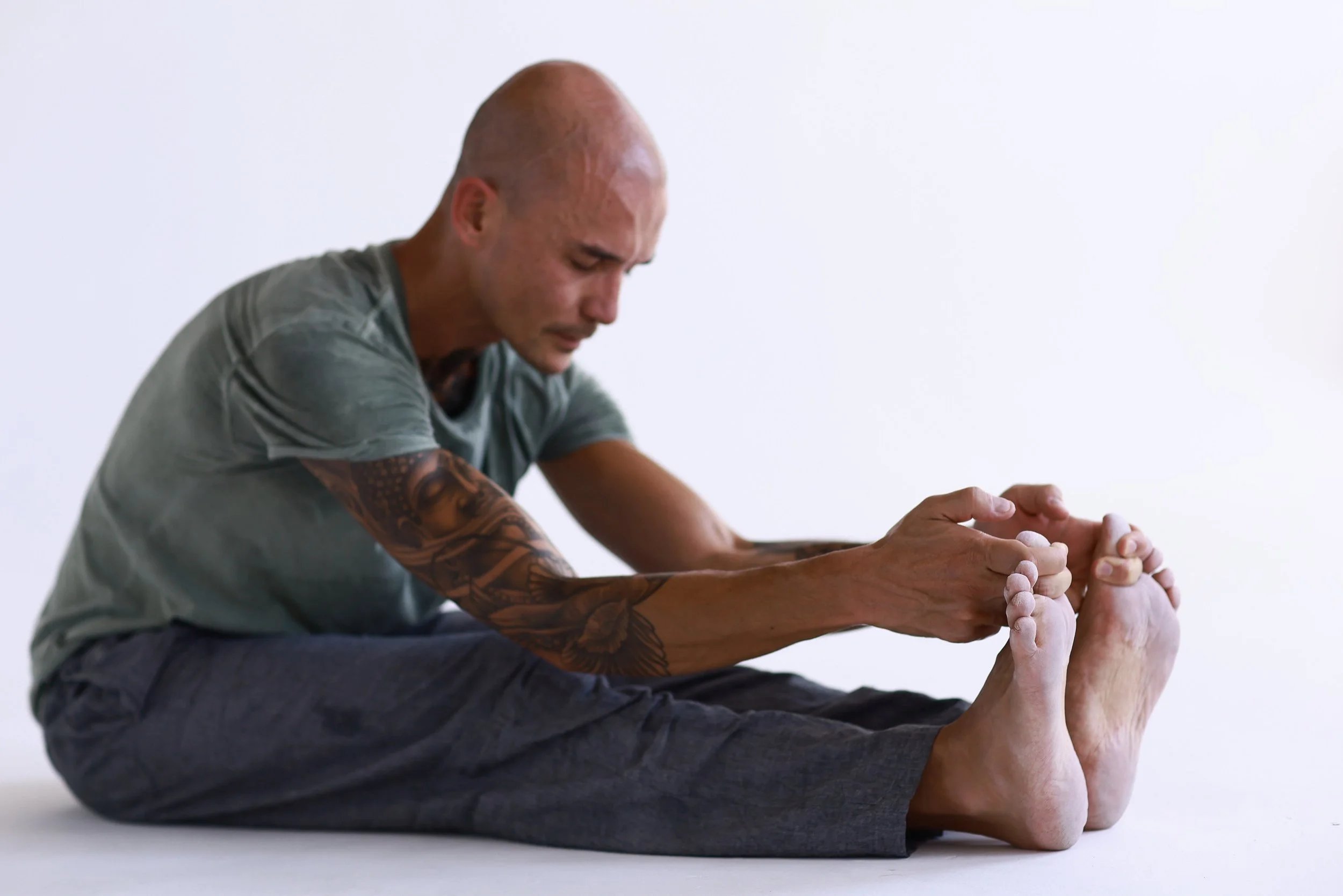 Slow meditative poses held for 5-6 minutes to release tension